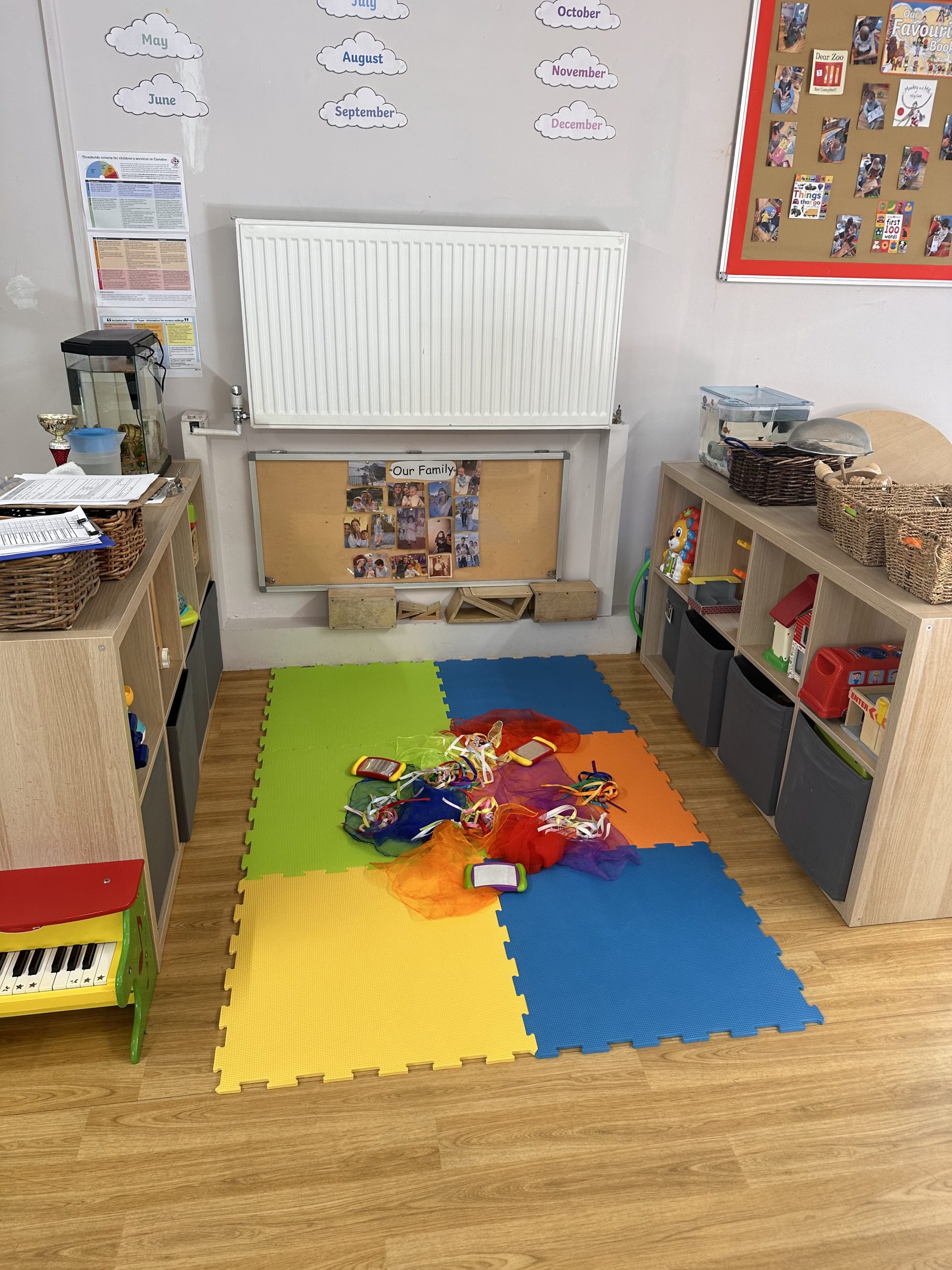 All our activities are floor based with soft furnishings on the floor for the children to move about freely on their own or with the support of an adult to be safe as well as explore. We have an open door policy for parents to come and play with their child and see what their child gets up to during the day. This really worked out for one parent as she worked on the same street and spent her lunch break in the room joining in with activities – she was like having an extra member of staff in the room and mum said she loves having this opportunity. Her child has now moved upstairs and she continues to do the same thing there.
